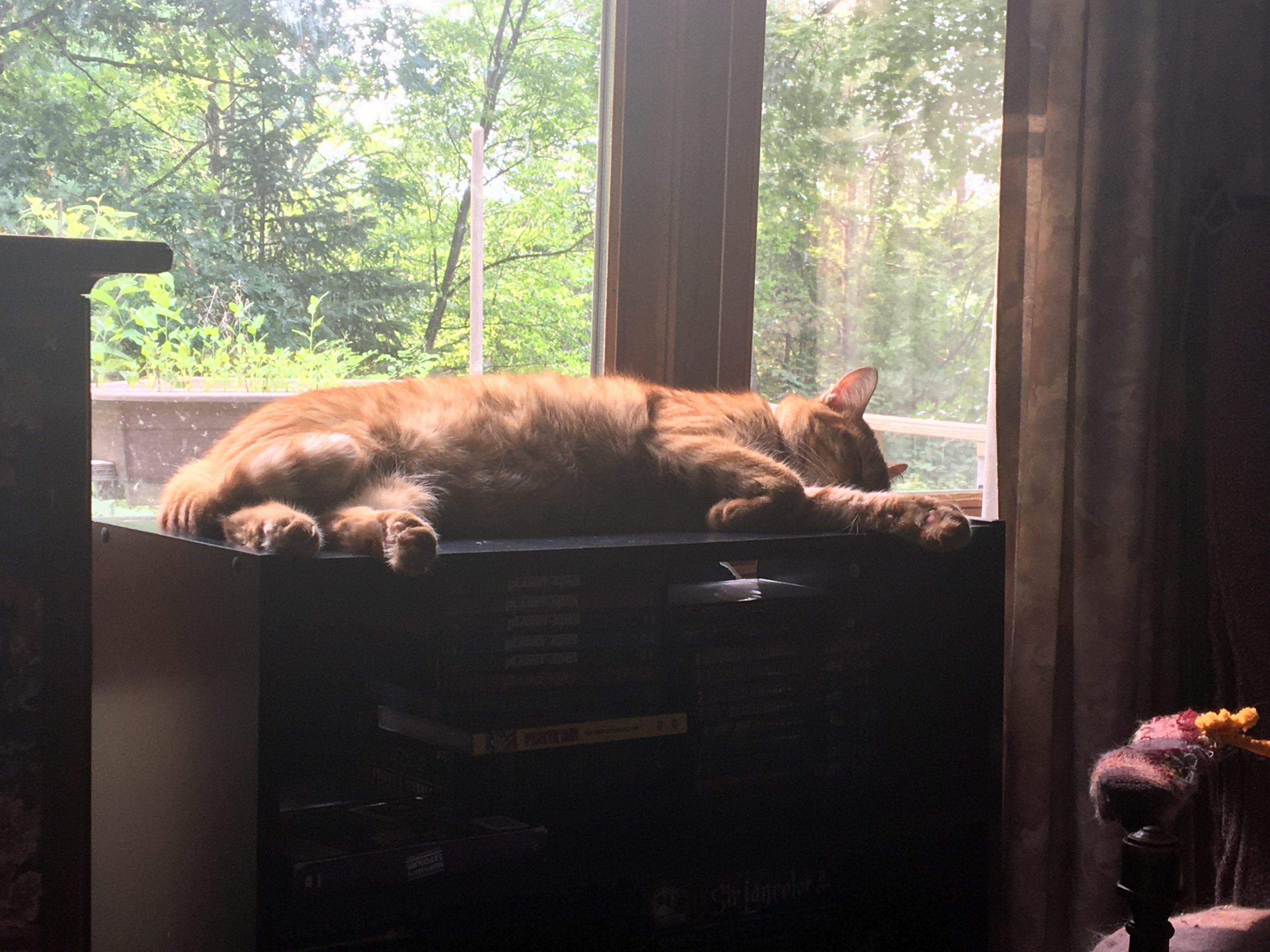 Larry sleeping on the DVD shelves.