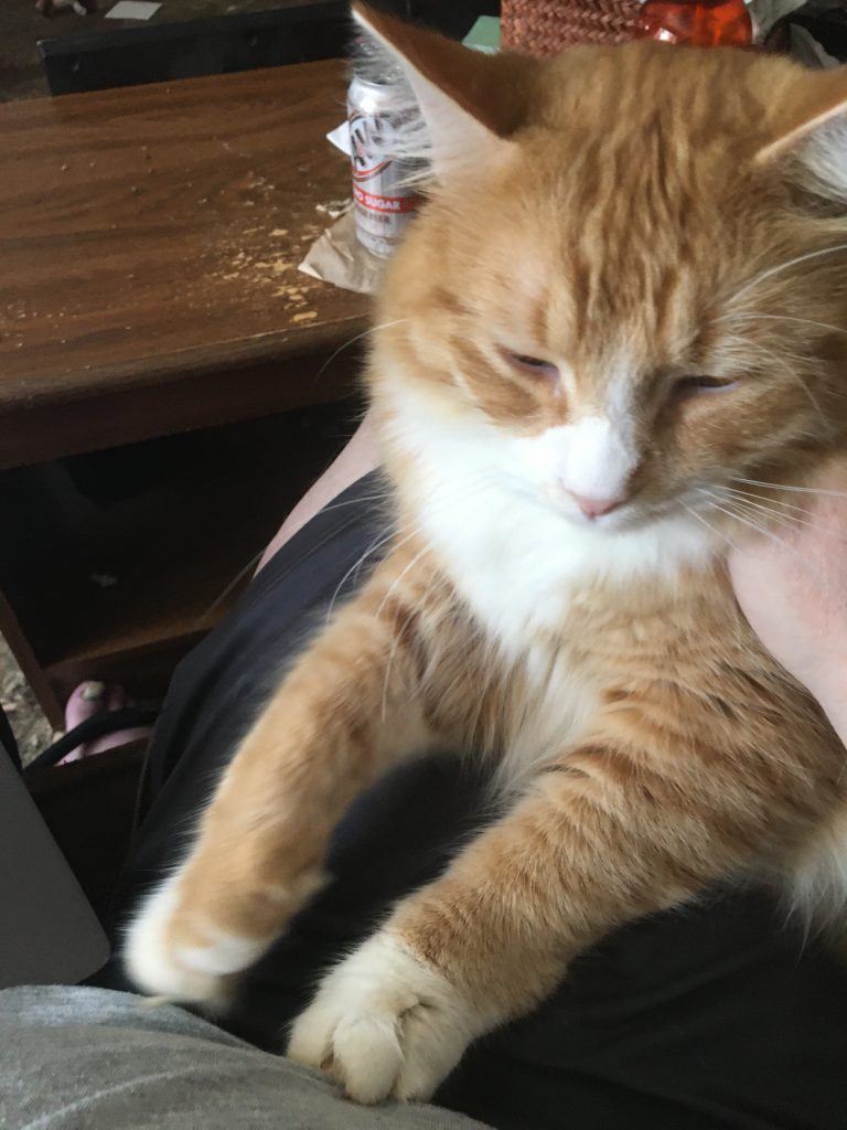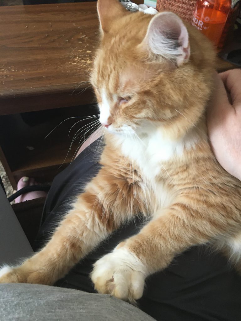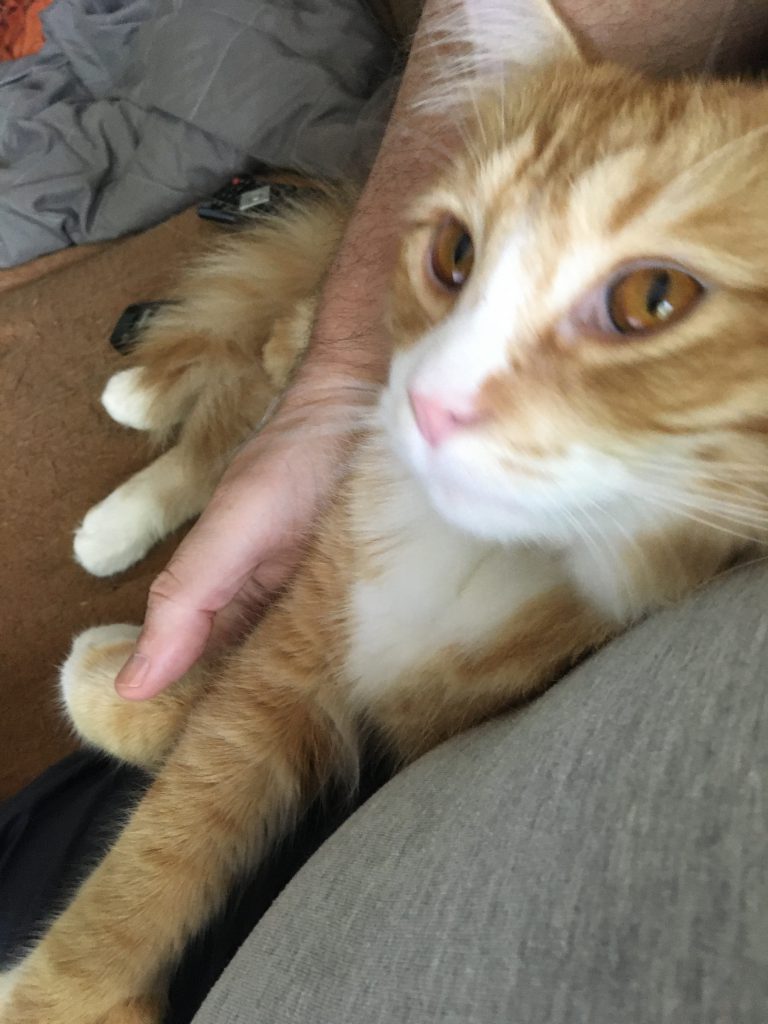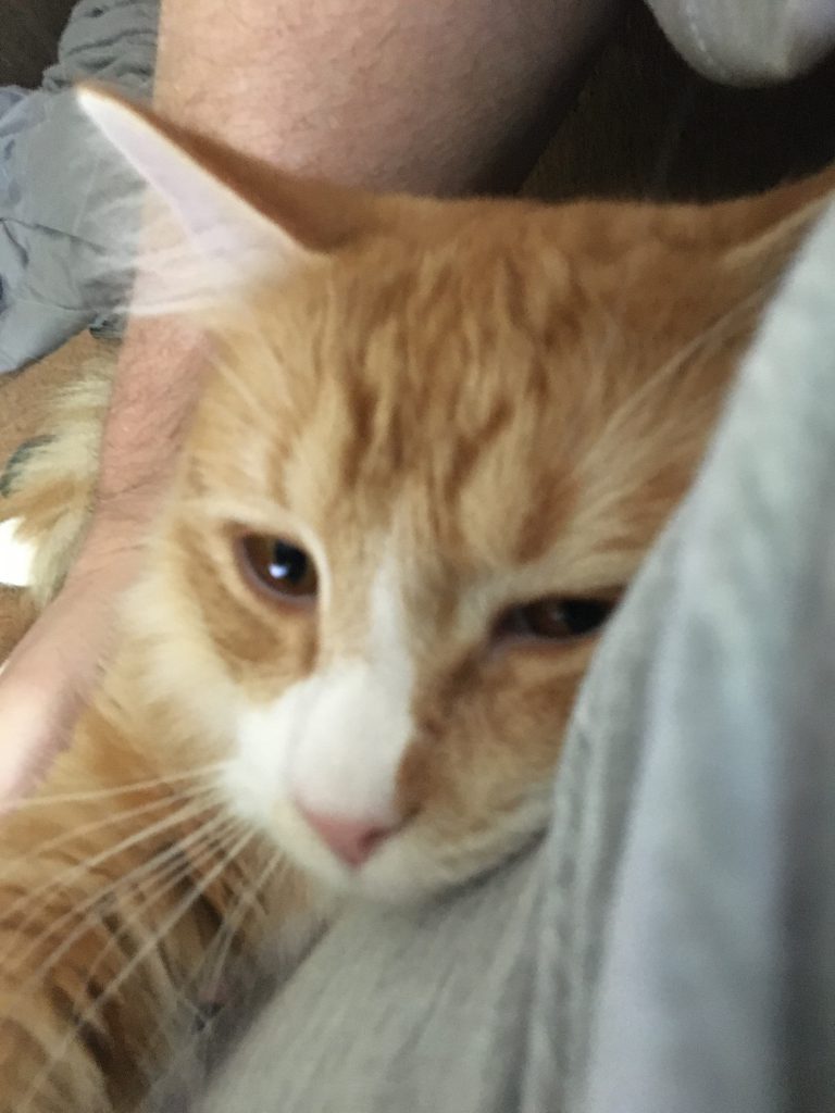 This is Jerry, my Boop Kitty. He likes to curl up in the crook of my arm, sometimes on his back. He reaches up gently and boops my nose.